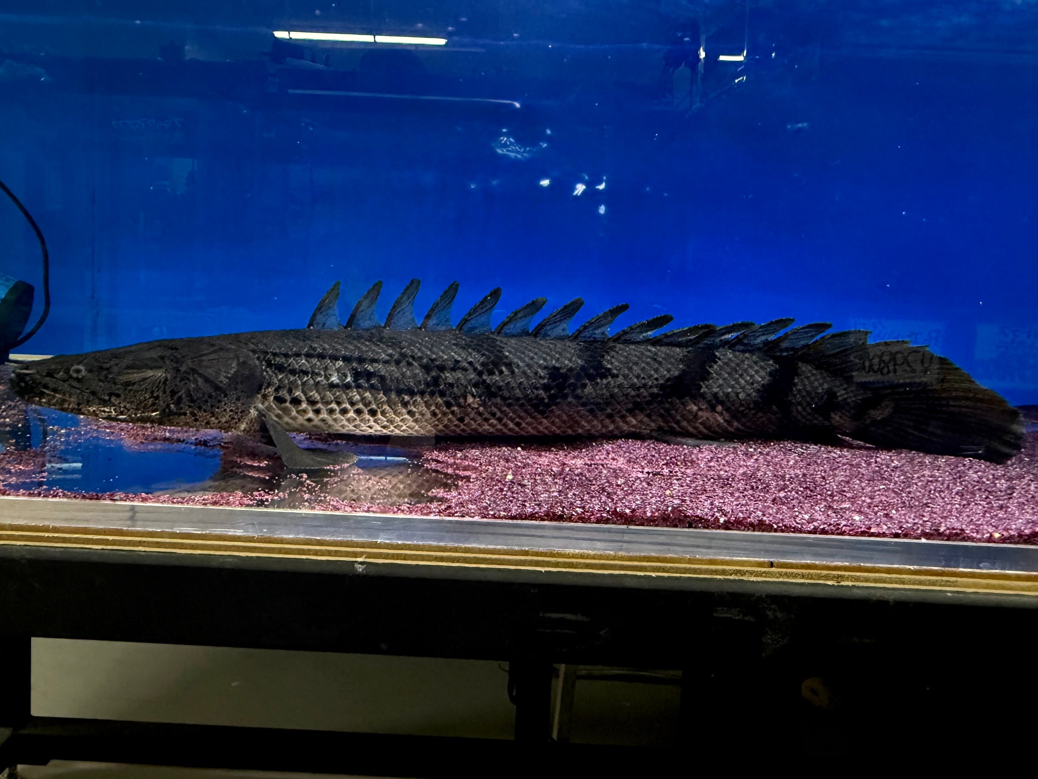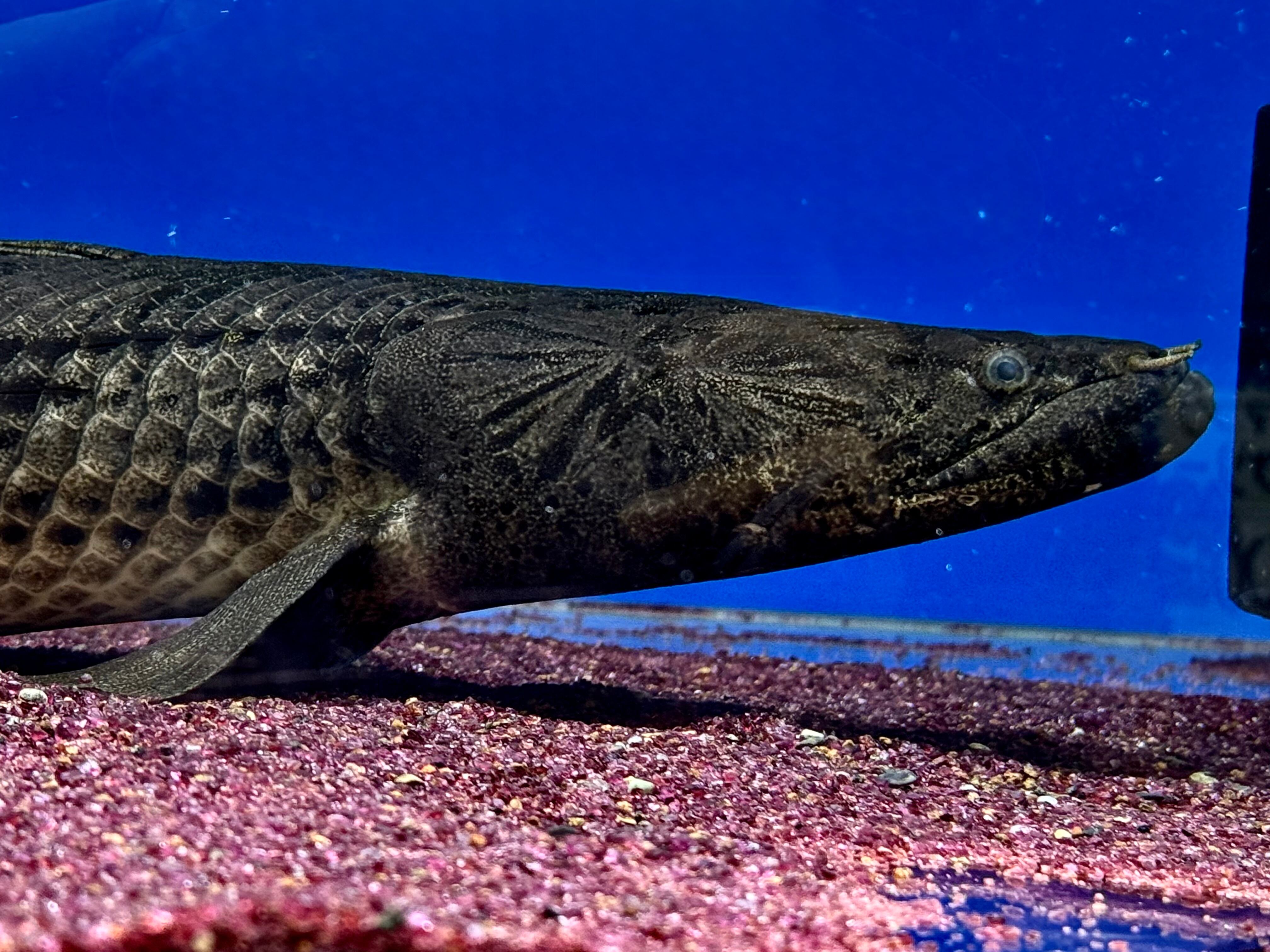 ⬛︎特徴: ポリプテルスは「多くの(Poly)ひれ(pterus)」という意味で、名のとおり背中に小離鰭(しょうりき)と呼ばれる菱形の背びれが10枚前後ある。これは、尾びれに当たる位置にまで並び、尾びれに該当する鰭はない。種類によって枚数異なる(コンギクスは12~15枚並ぶのが特徴)またガノイン鱗や鼻管などもこの種の特徴。