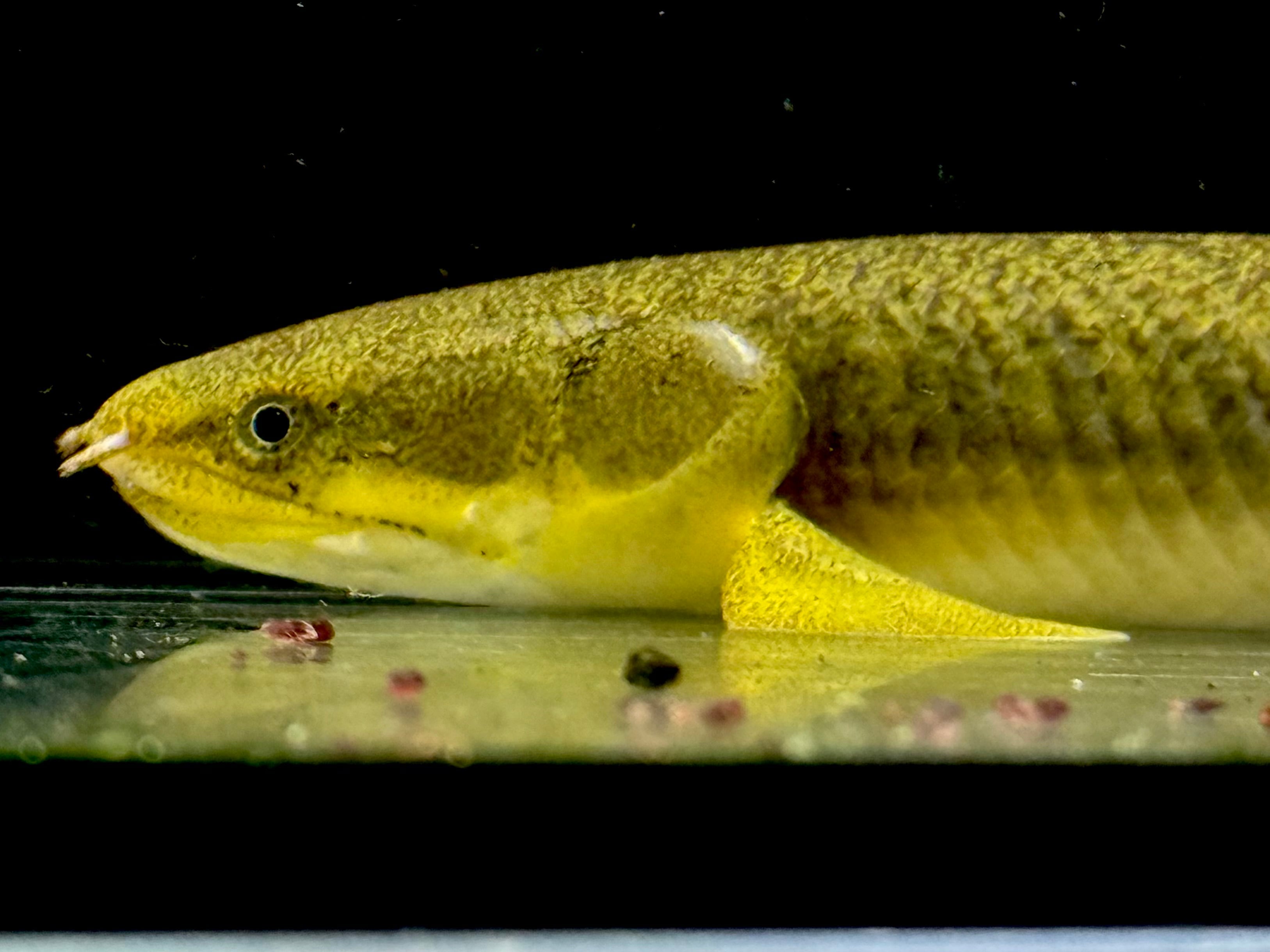⬛︎特徴: ポリプテルスは「多くの(Poly)ひれ(pterus)」という意味で、名のとおり背中に小離鰭(しょうりき)と呼ばれる菱形の背びれが10枚前後ある。これは、尾びれに当たる位置にまで並び、尾びれに該当する鰭はない。種類によって枚数異なる(ビュティコは7~10枚並ぶのが特徴)またガノイン鱗や鼻管などもこの種の特徴。鰓呼吸と並行して空気呼吸をする。