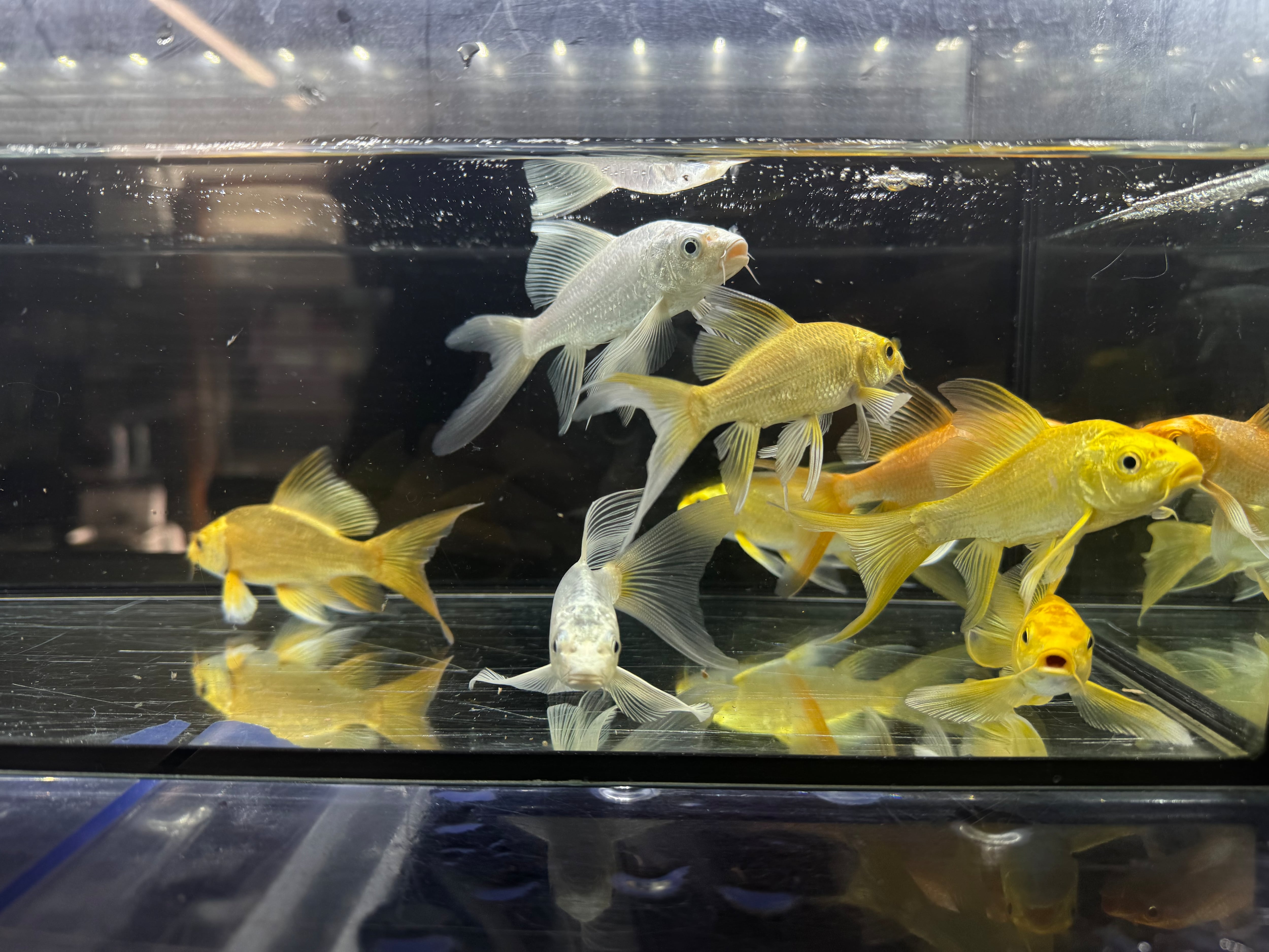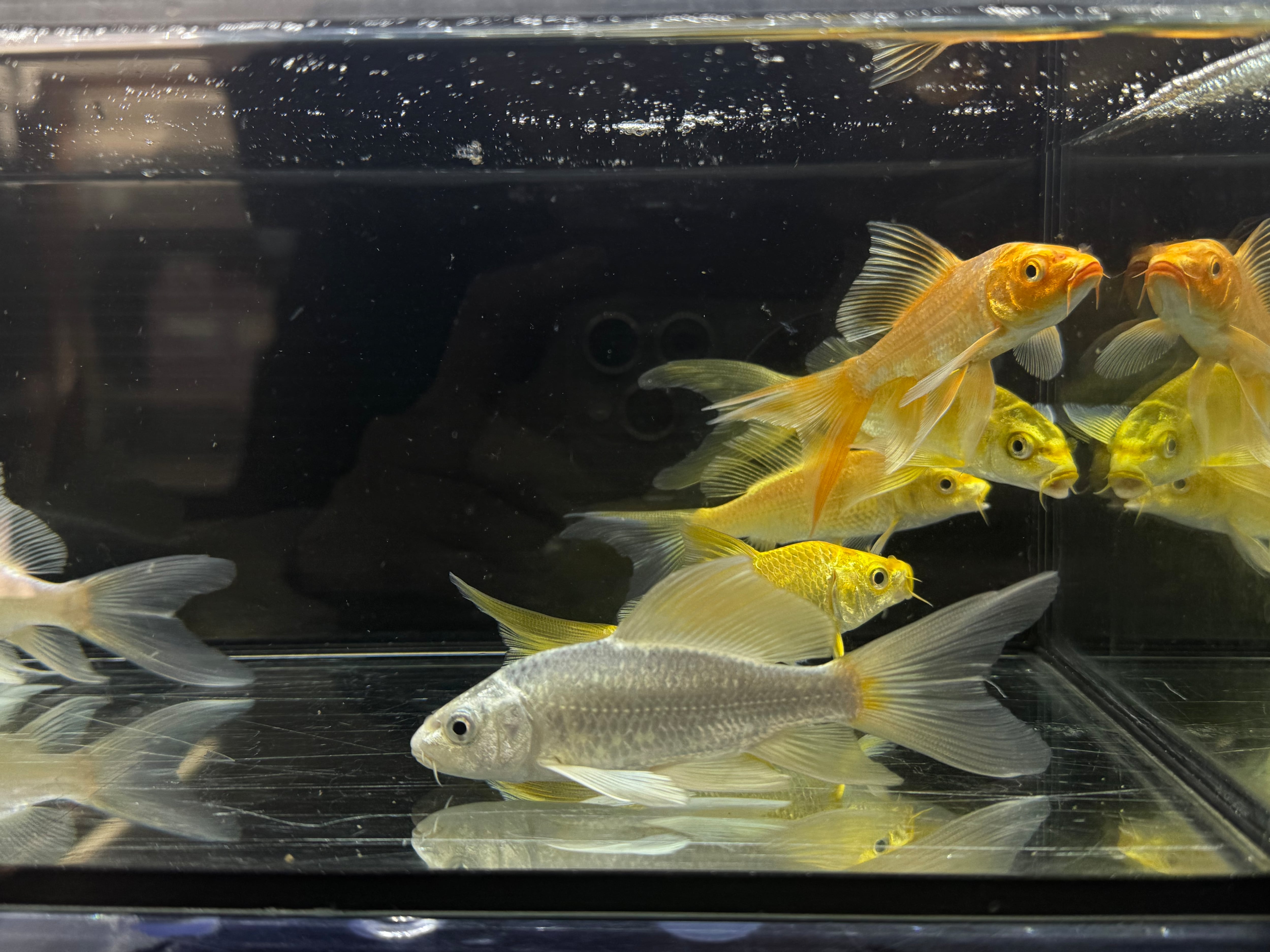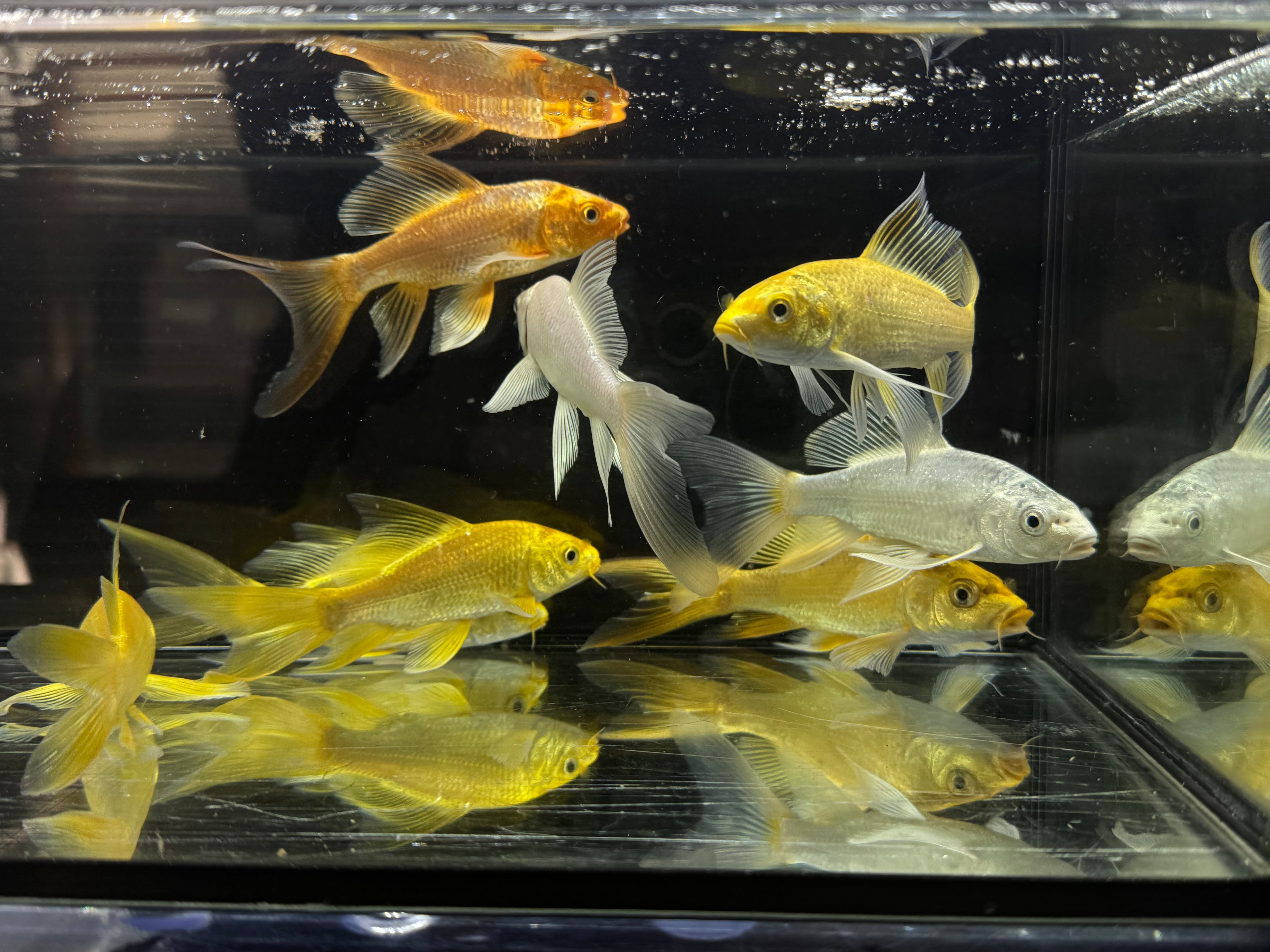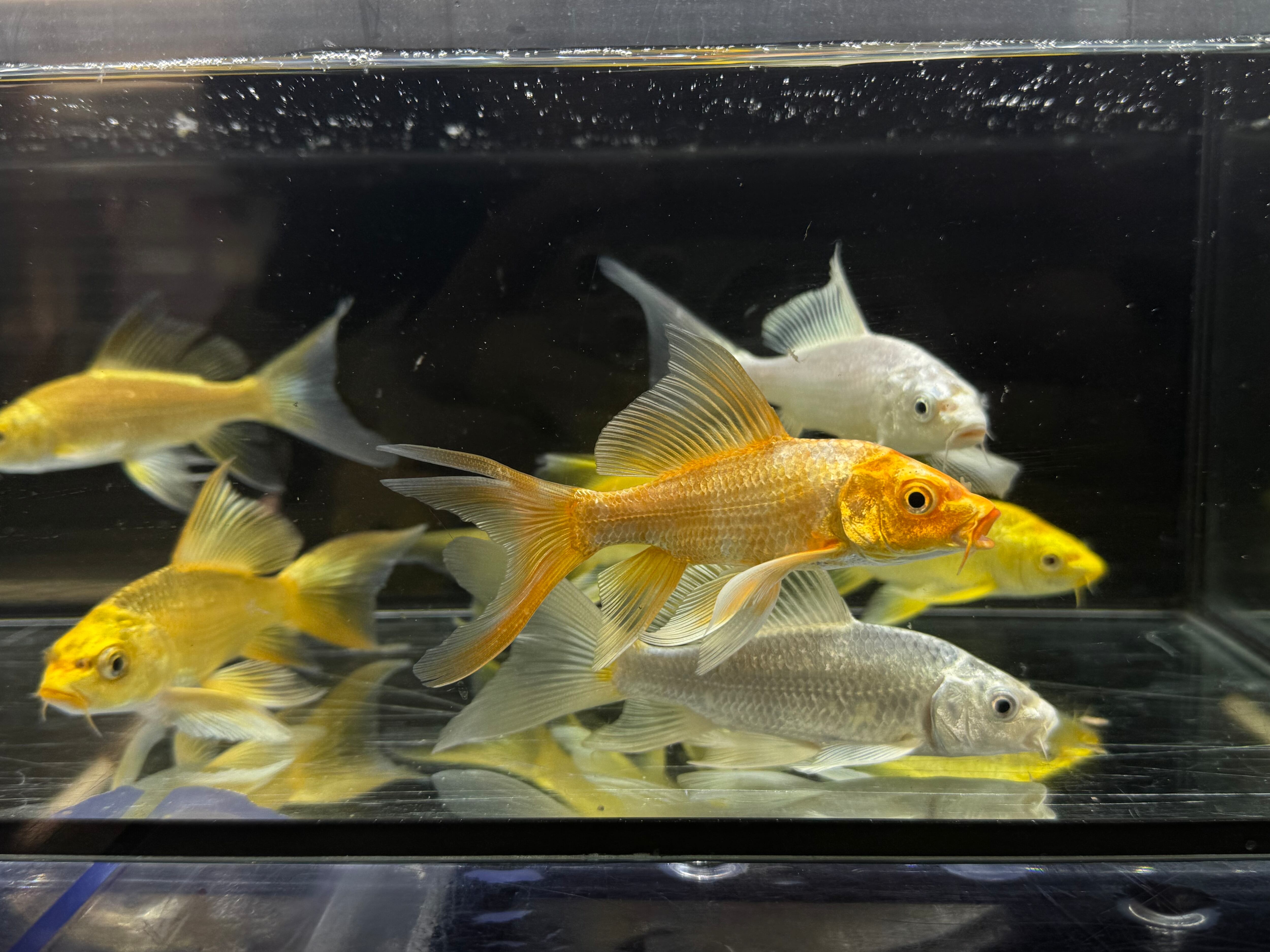 ⬛︎特徴:ヒレナガゴイの特徴はその長いヒレです。この長いヒレは錦鯉よりも長く、それを揺らして泳ぐ様はとても優雅です。幼魚は金色の体色が特徴的ですが、大きくなると品種ごとに様々な模様に変化します。
