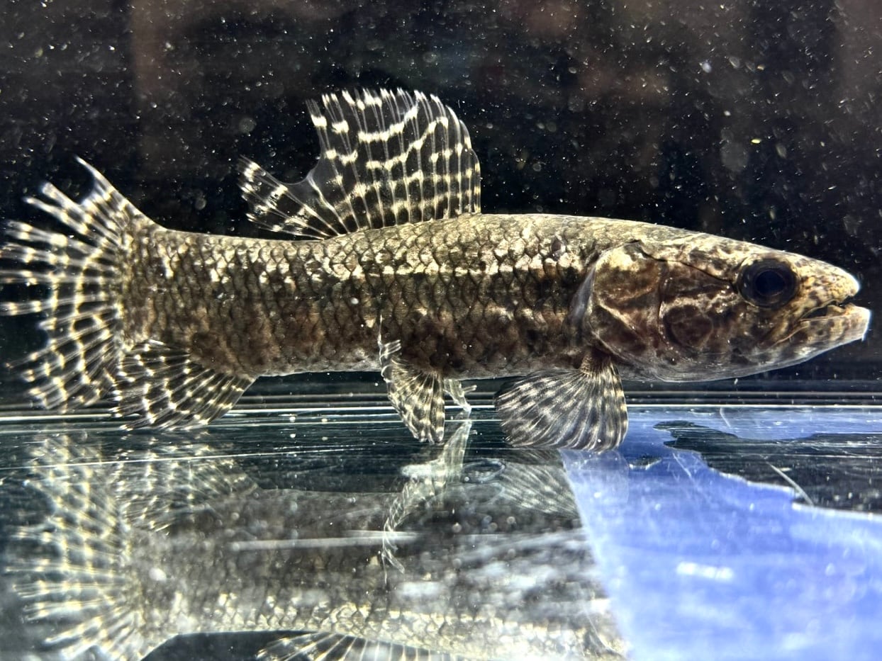 ⬛︎特徴: 黒い体色に黄~茶褐色の斑点があります。タライロンの中では比較的性格は大人しく混泳はしやすい傾向。自分より小さな魚は攻撃して食べようしますし混泳しやすいのはあくまで幼魚期。あとは個体の性格が影響します。「シーラカンス」に1番近いフォルムをしています。