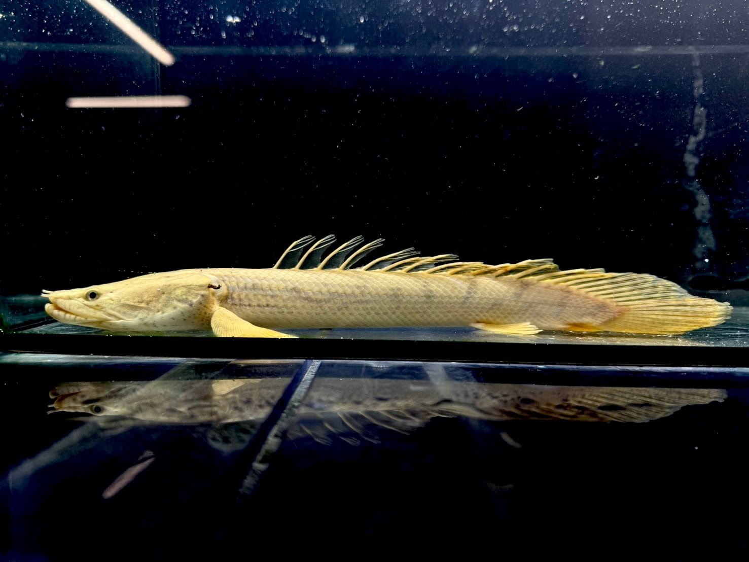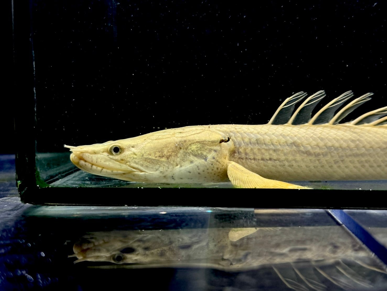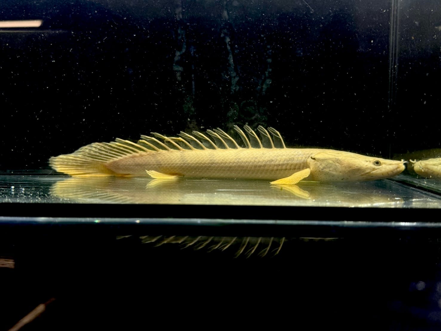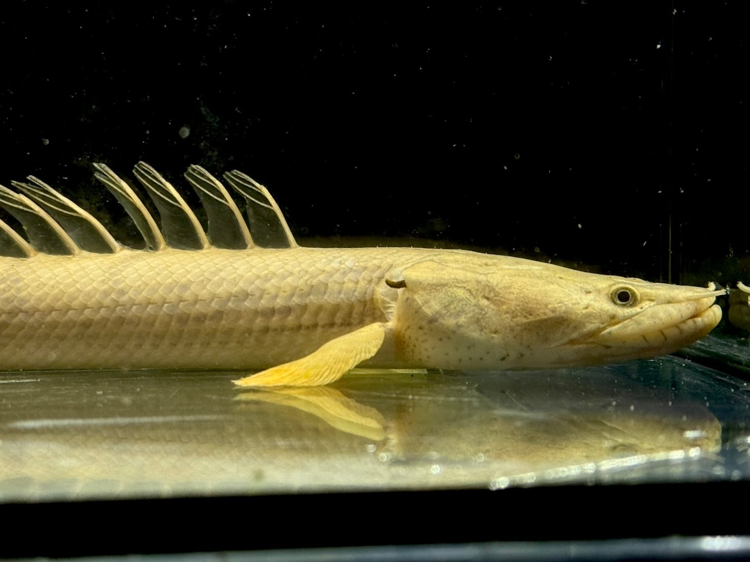 ⬛︎特徴: ポリプテルスは「多くの(Poly)ひれ(pterus)」という意味で、名のとおり背中に小離鰭(しょうりき)と呼ばれる菱形の背びれが10枚前後ある。これは、尾びれに当たる位置にまで並び、尾びれに該当する鰭はない。種類によって枚数異なる(コンギクスは12~15枚並ぶのが特徴)またガノイン鱗や鼻管などもこの種の特徴。鰓呼吸と並行して空気呼吸をする。