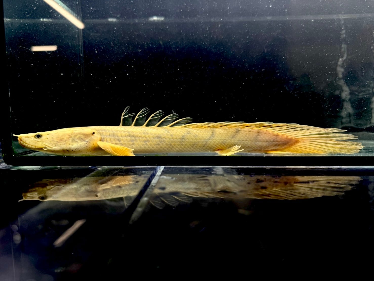 ⬛︎特徴: ポリプテルスは「多くの(Poly)ひれ(pterus)」という意味で、名のとおり背中に小離鰭(しょうりき)と呼ばれる菱形の背びれが10枚前後ある。これは、尾びれに当たる位置にまで並び、尾びれに該当する鰭はない。種類によって枚数異なる(コンギクスは12~15枚並ぶのが特徴)またガノイン鱗や鼻管などもこの種の特徴。鰓呼吸と並行して空気呼吸をする。