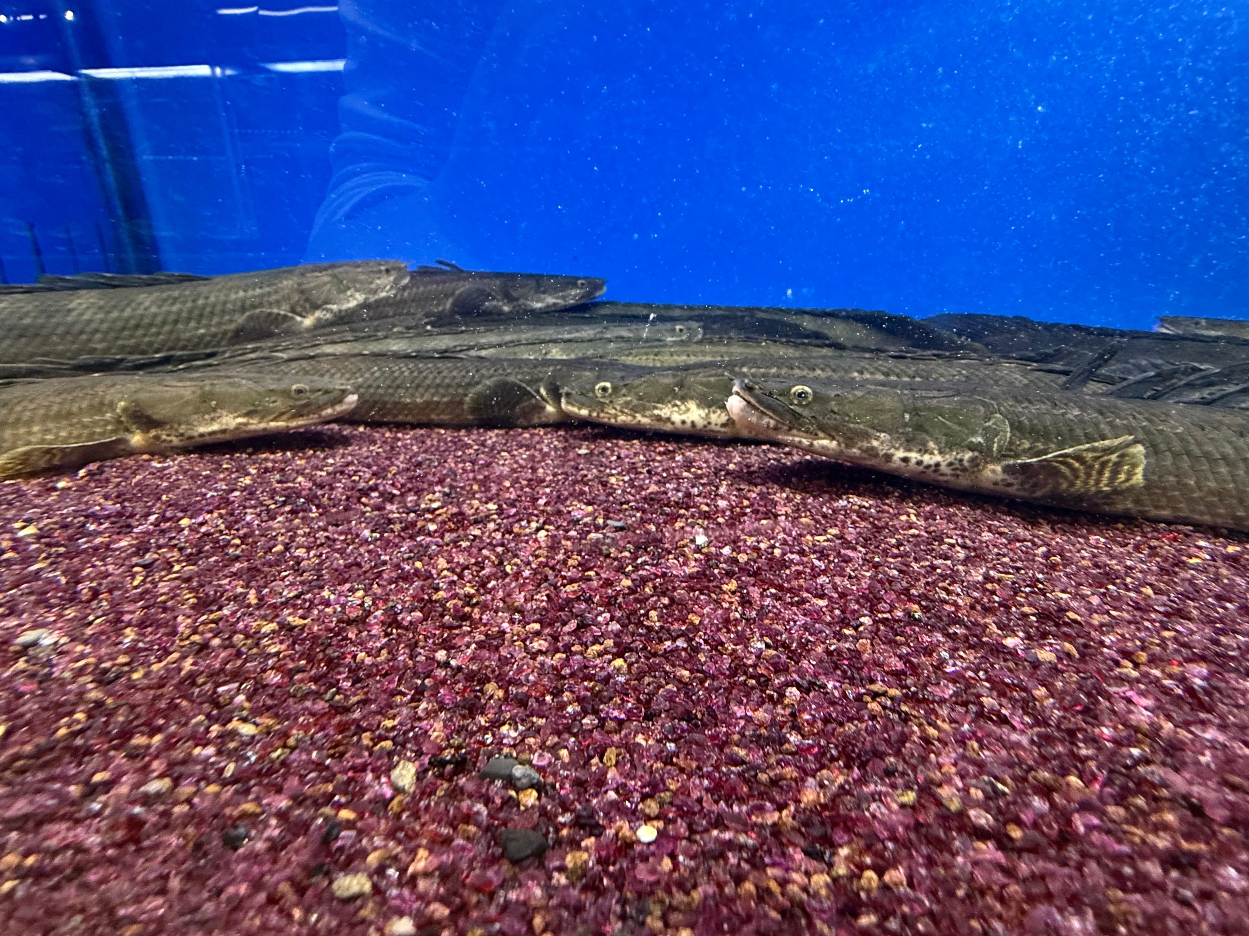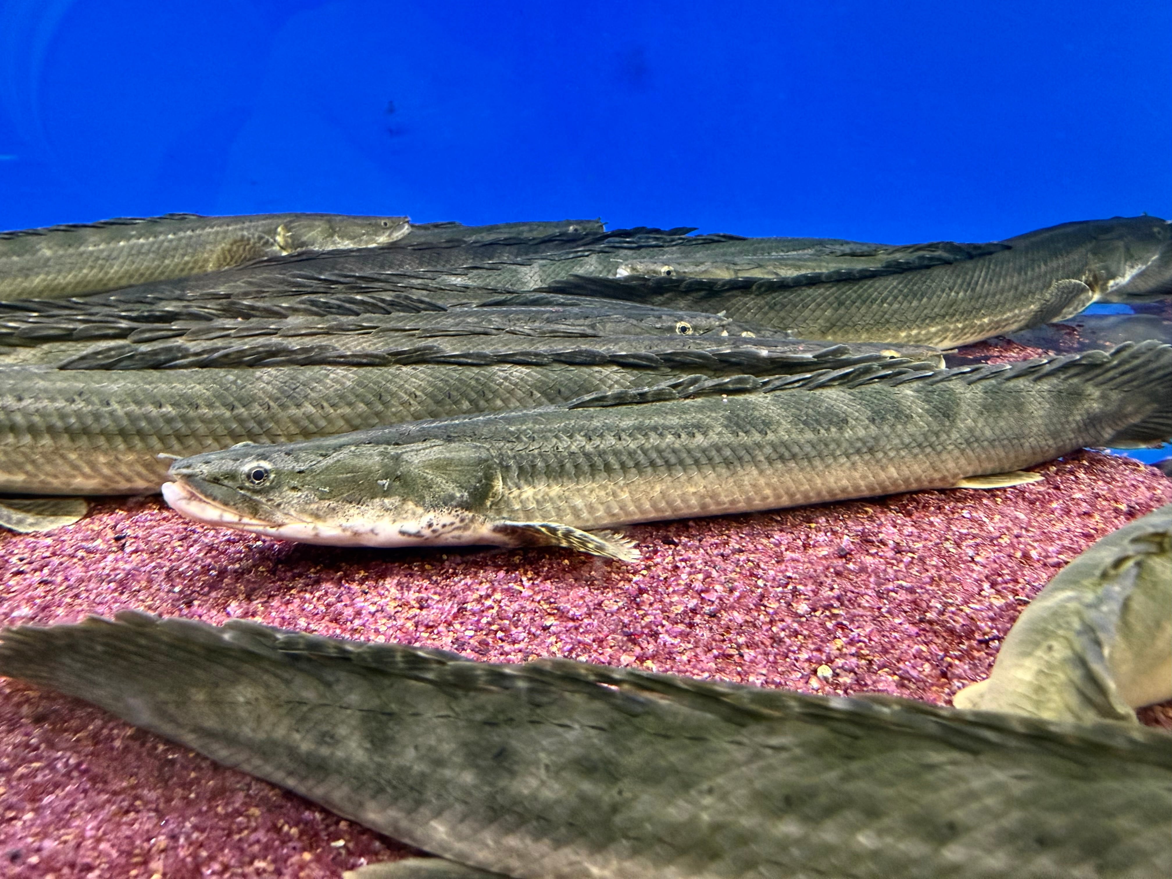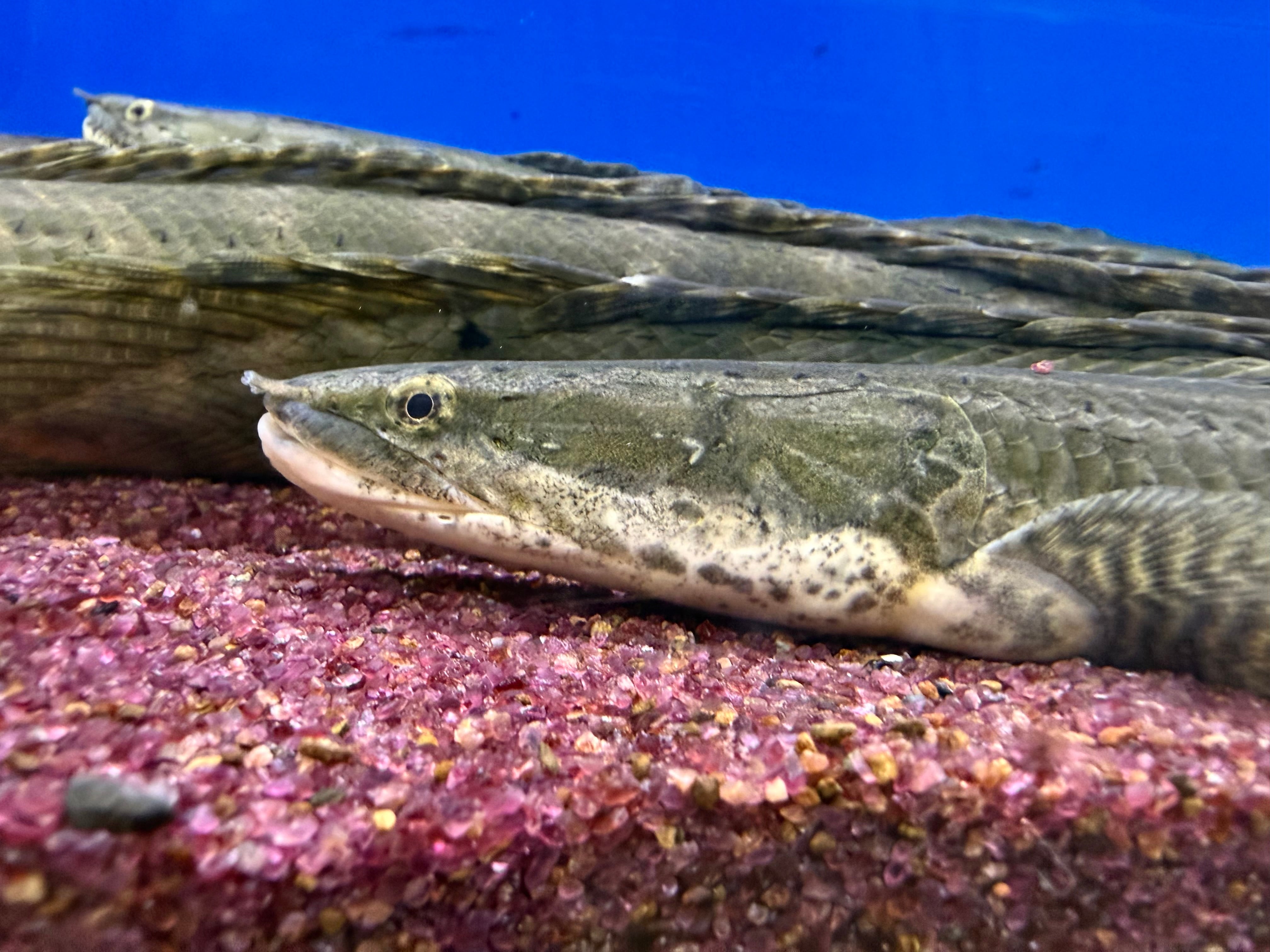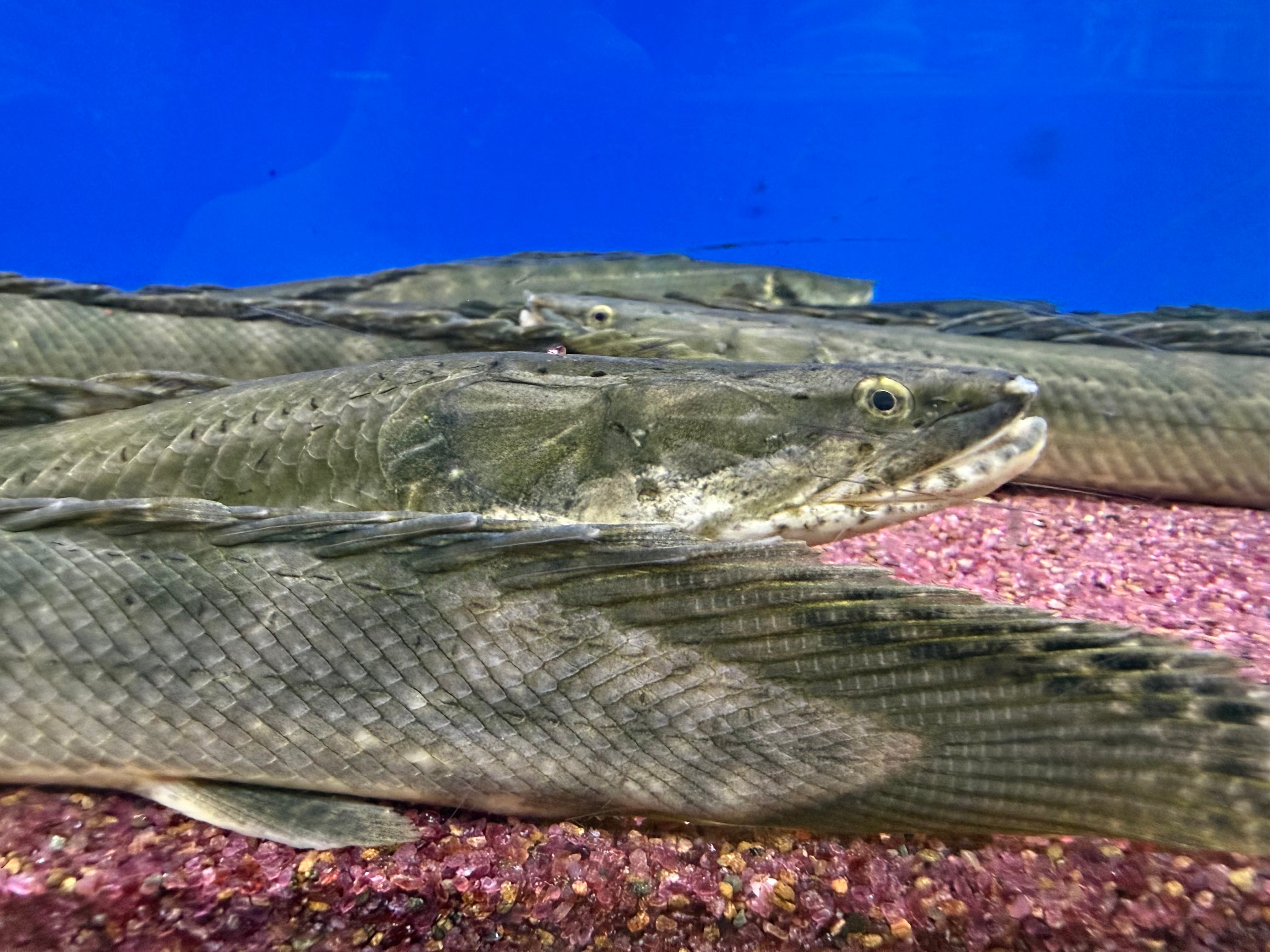 ⬛︎特徴: ⬛︎特徴: ポリプテルスは「多くの(Poly)ひれ(pterus)」という意味で、名のとおり背中に小離鰭(しょうりき)と呼ばれる菱形の背びれが10枚前後ある。これは、尾びれに当たる位置にまで並び、尾びれに該当する鰭はない。種類によって枚数異なる(ビキールは14~18枚並ぶのが特徴)またガノイン鱗や鼻管などもこの種の特徴。鰓呼吸と並行して空気呼吸をする。