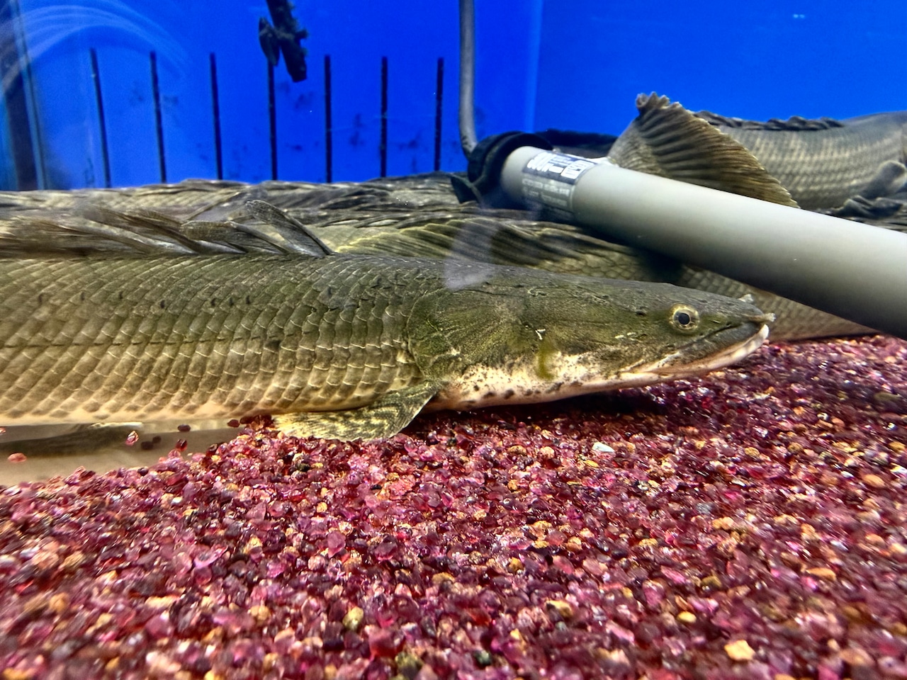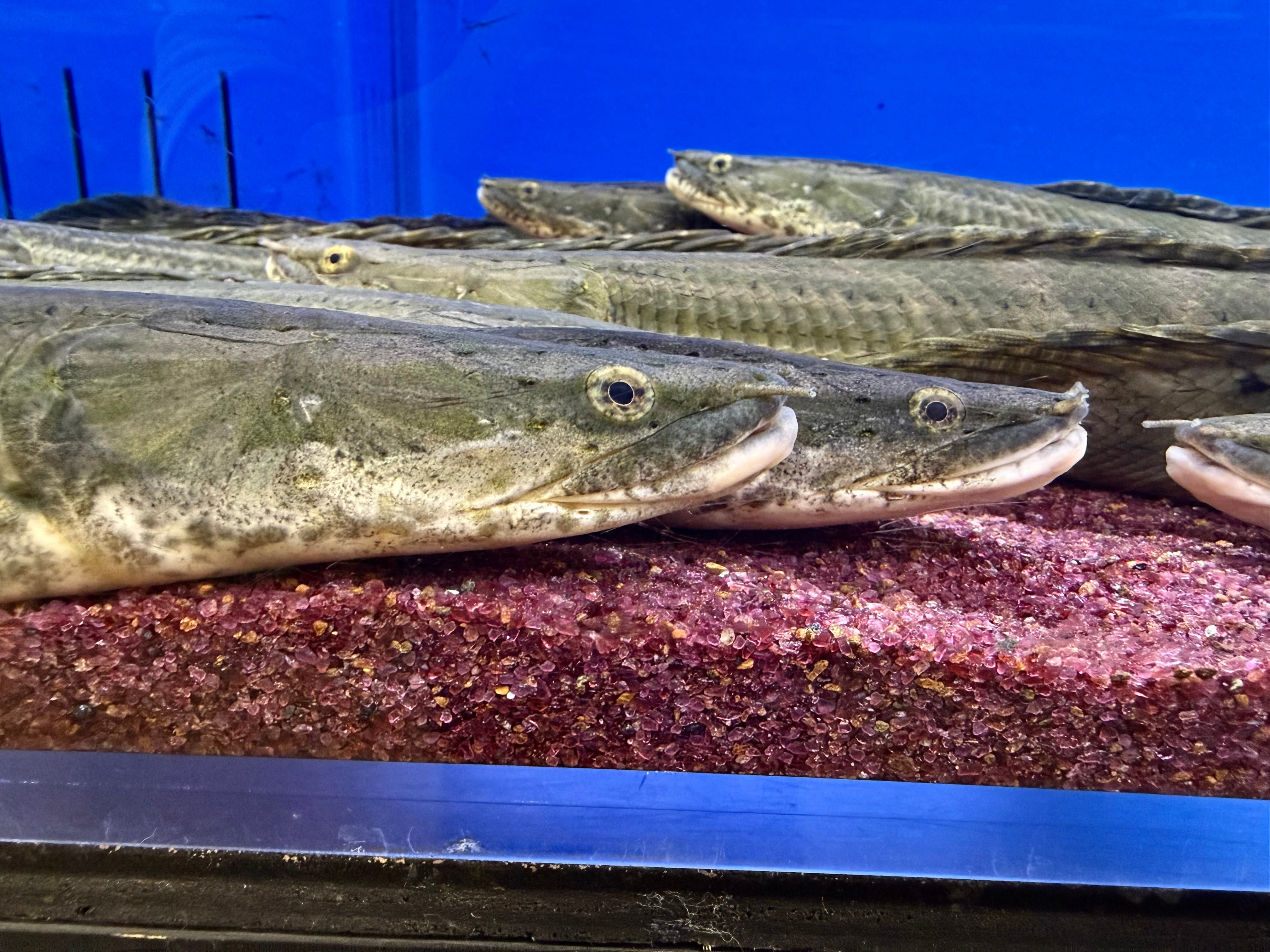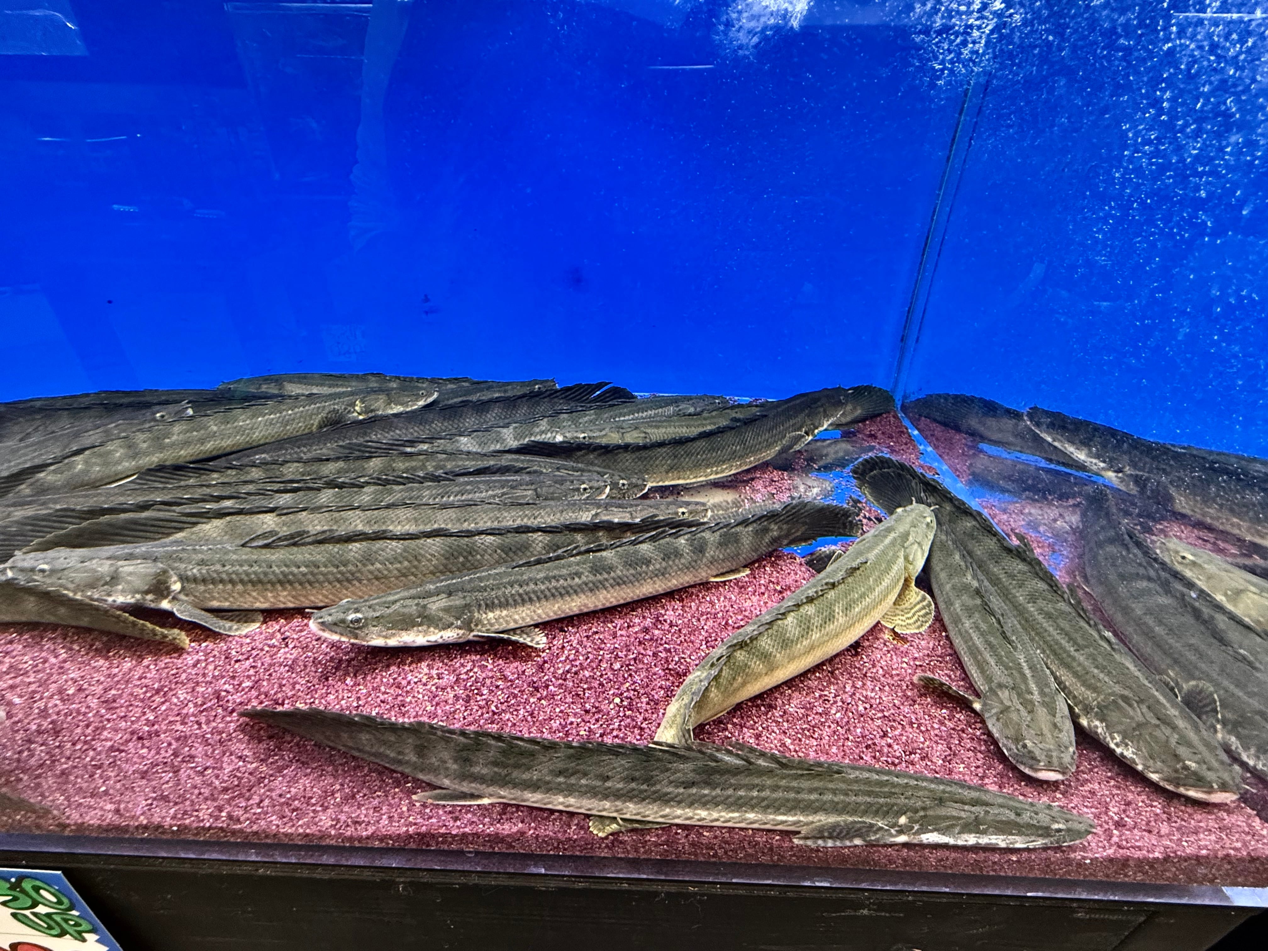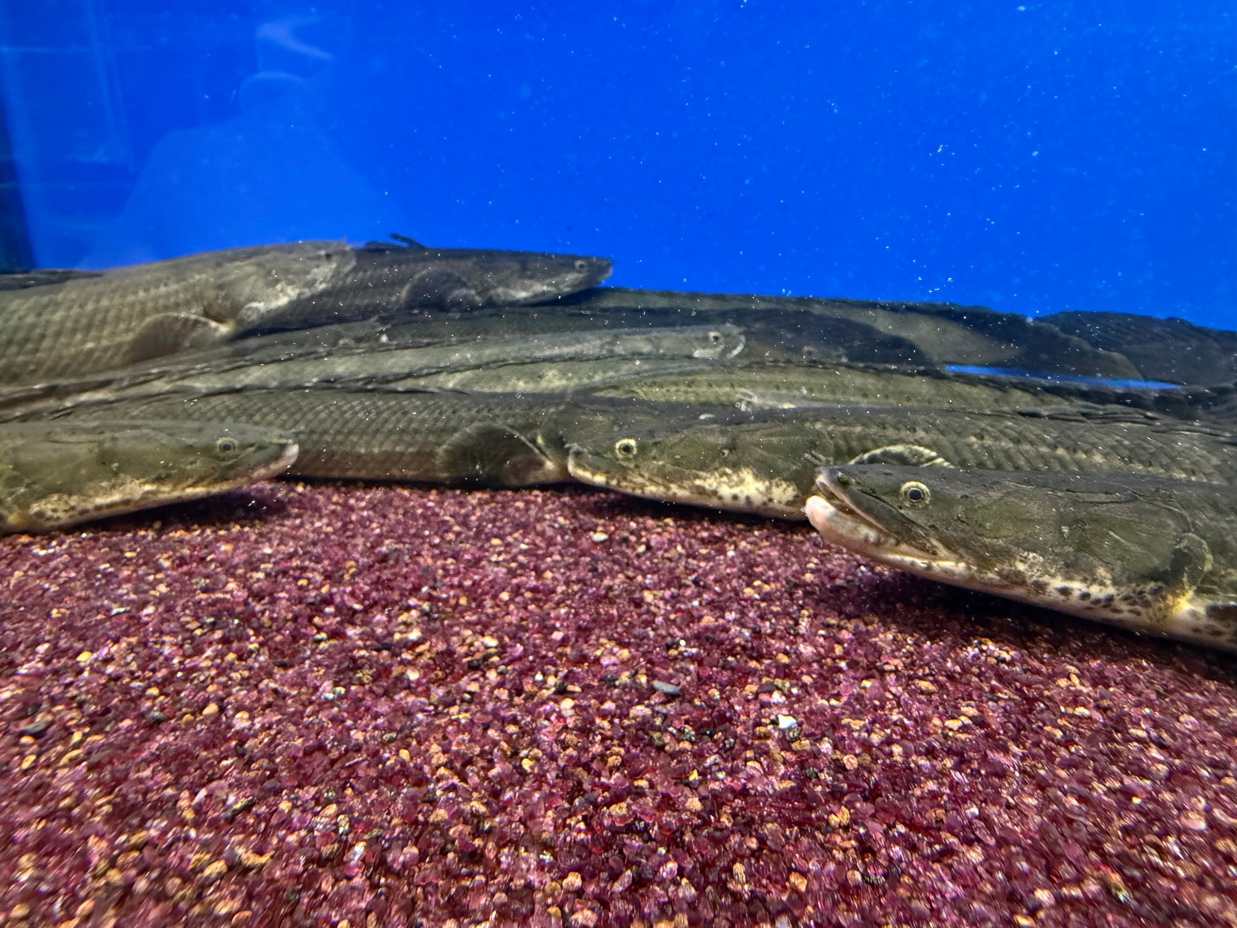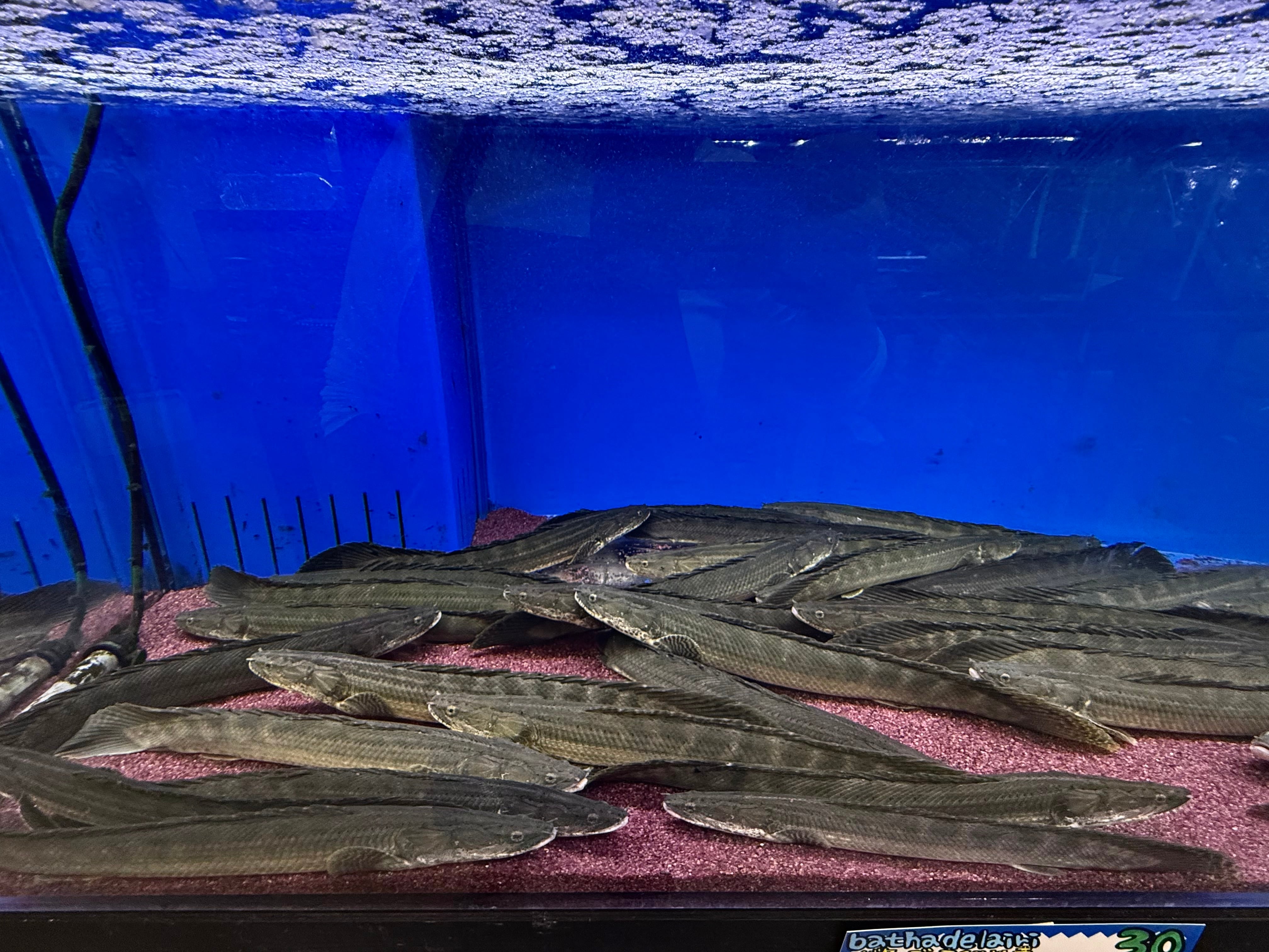 ⬛︎特徴: ⬛︎特徴: ポリプテルスは「多くの(Poly)ひれ(pterus)」という意味で、名のとおり背中に小離鰭(しょうりき)と呼ばれる菱形の背びれが10枚前後ある。これは、尾びれに当たる位置にまで並び、尾びれに該当する鰭はない。種類によって枚数異なる(ビキールは14~18枚並ぶのが特徴)またガノイン鱗や鼻管などもこの種の特徴。鰓呼吸と並行して空気呼吸をする。
