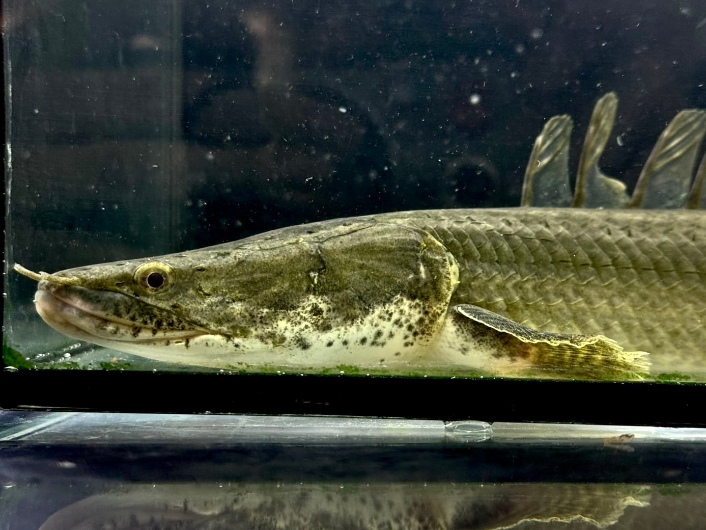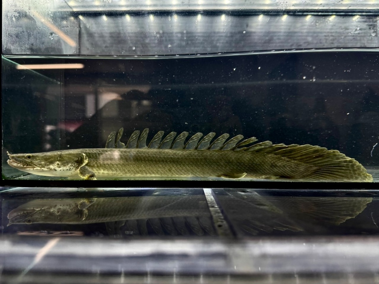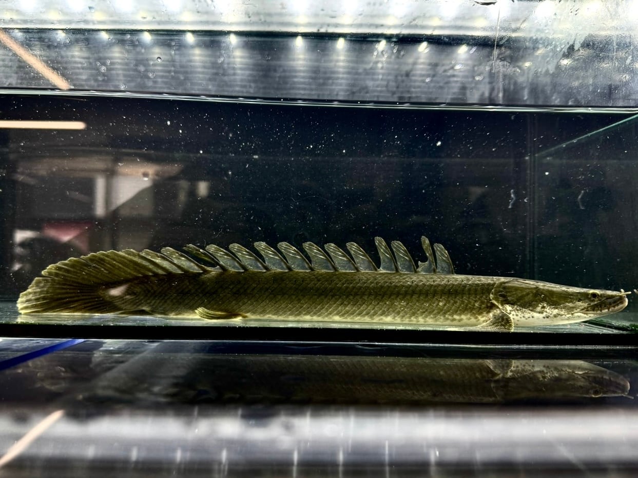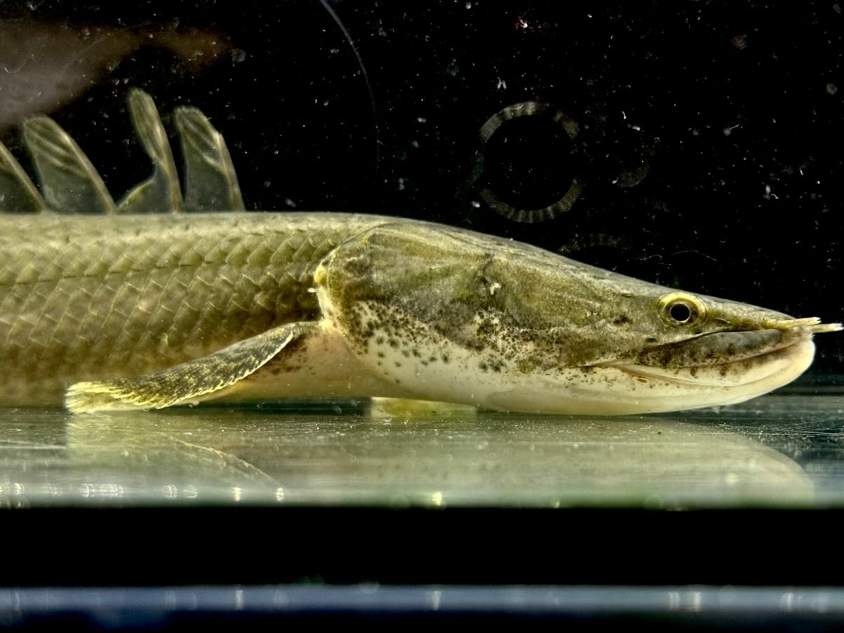 ⬛︎特徴: ⬛︎特徴: ポリプテルスは「多くの(Poly)ひれ(pterus)」という意味で、名のとおり背中に小離鰭(しょうりき)と呼ばれる菱形の背びれが10枚前後ある。これは、尾びれに当たる位置にまで並び、尾びれに該当する鰭はない。種類によって枚数異なる(ビキールは14~18枚並ぶのが特徴)またガノイン鱗や鼻管などもこの種の特徴。鰓呼吸と並行して空気呼吸をする。
