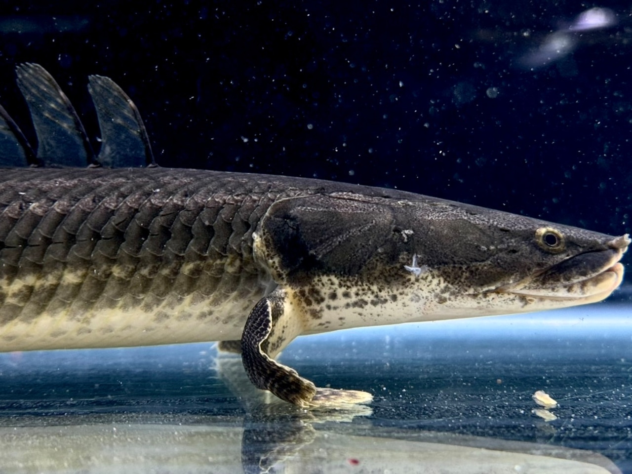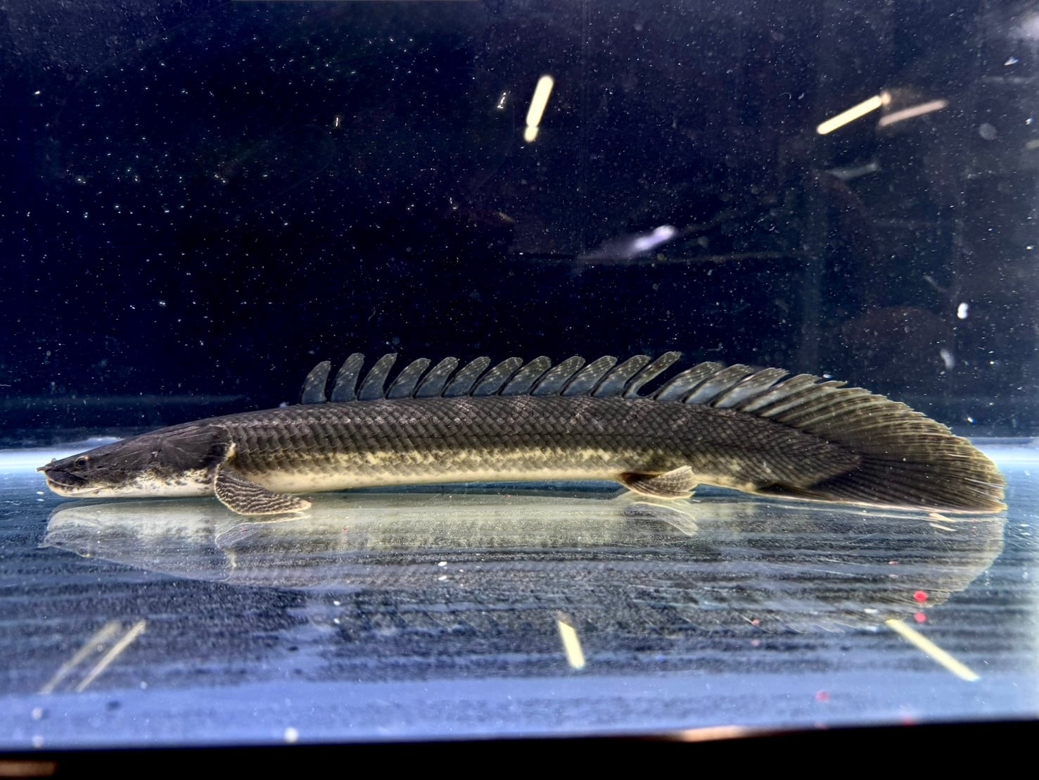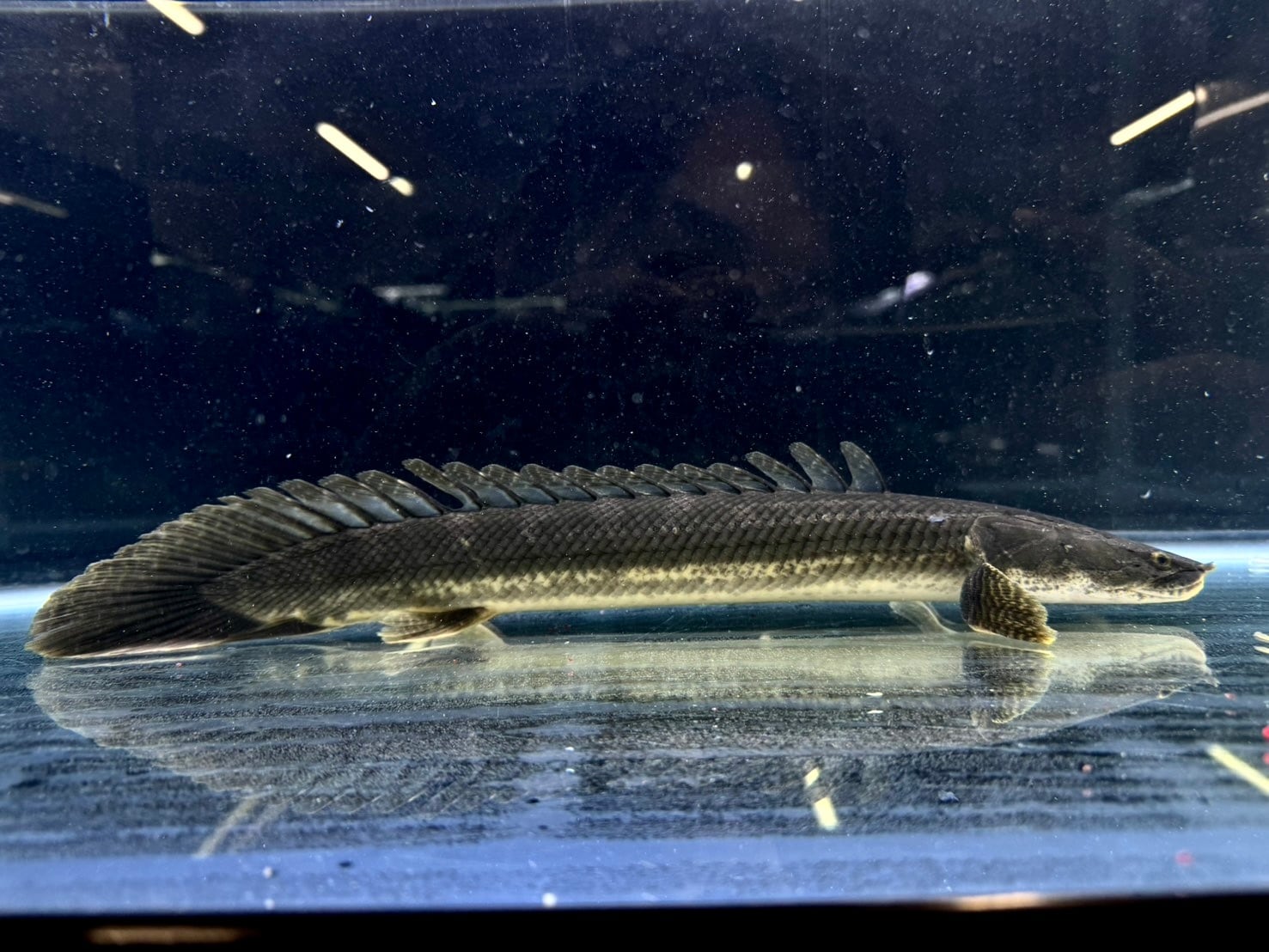 ⬛︎特徴: ⬛︎特徴: ポリプテルスは「多くの(Poly)ひれ(pterus)」という意味で、名のとおり背中に小離鰭(しょうりき)と呼ばれる菱形の背びれが10枚前後ある。これは、尾びれに当たる位置にまで並び、尾びれに該当する鰭はない。種類によって枚数異なる(ビキールは14~18枚並ぶのが特徴)またガノイン鱗や鼻管などもこの種の特徴。鰓呼吸と並行して空気呼吸をする。