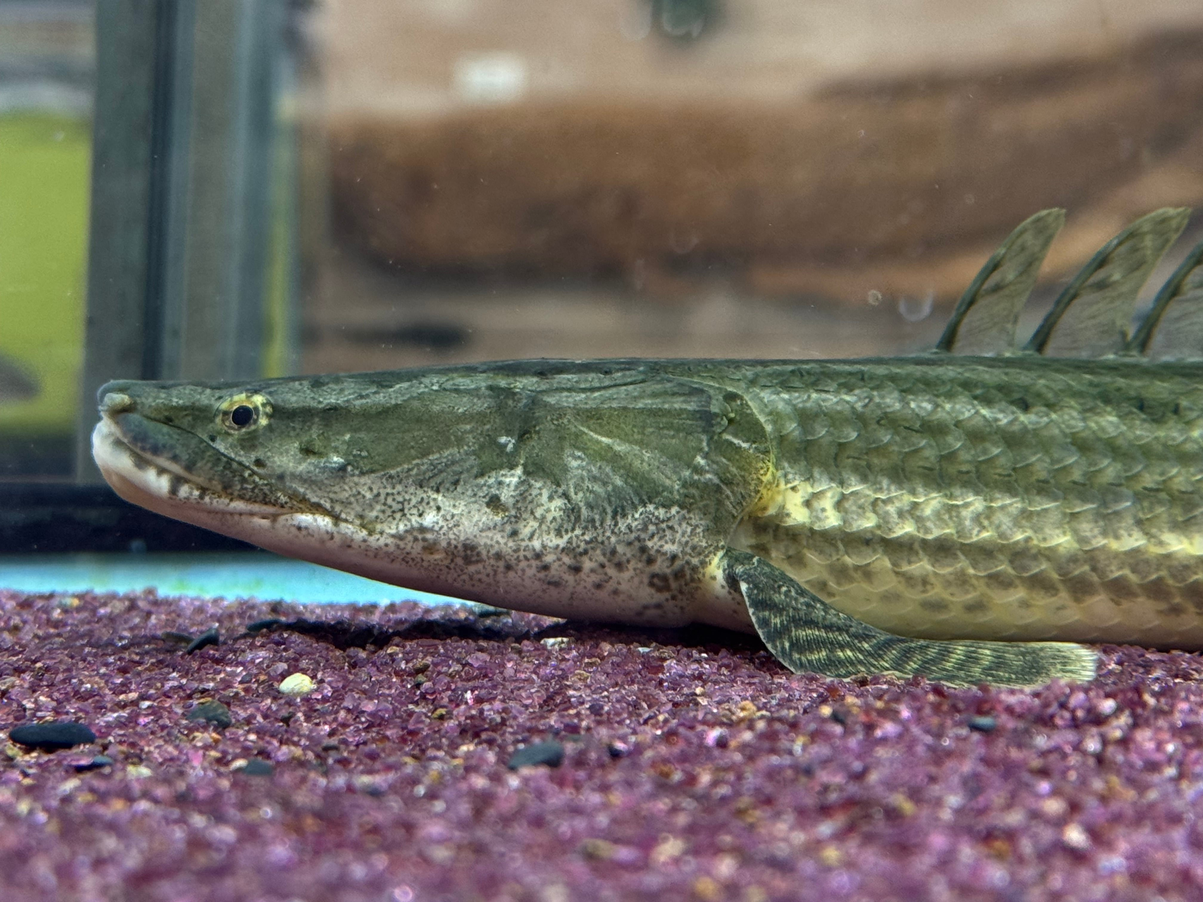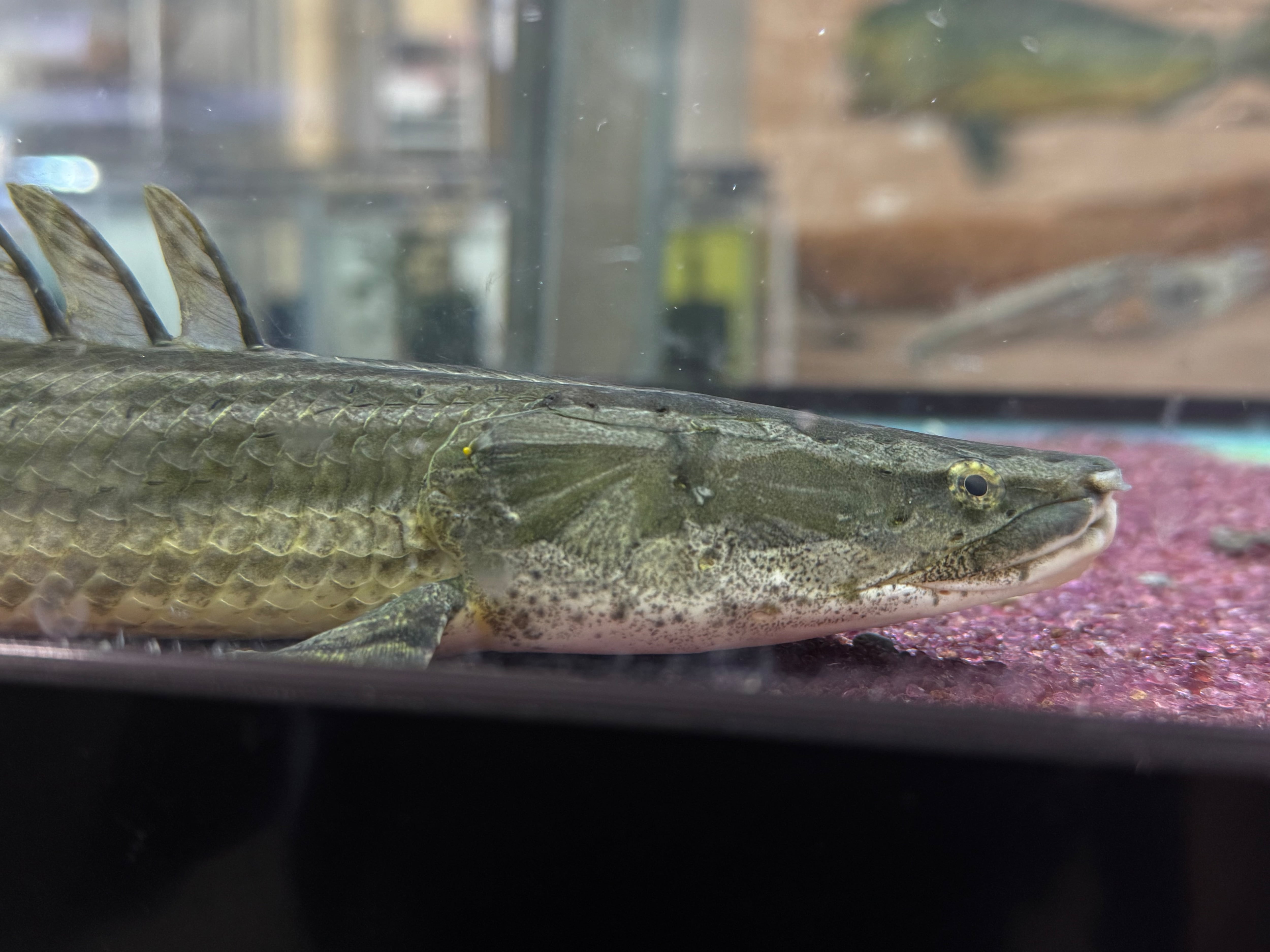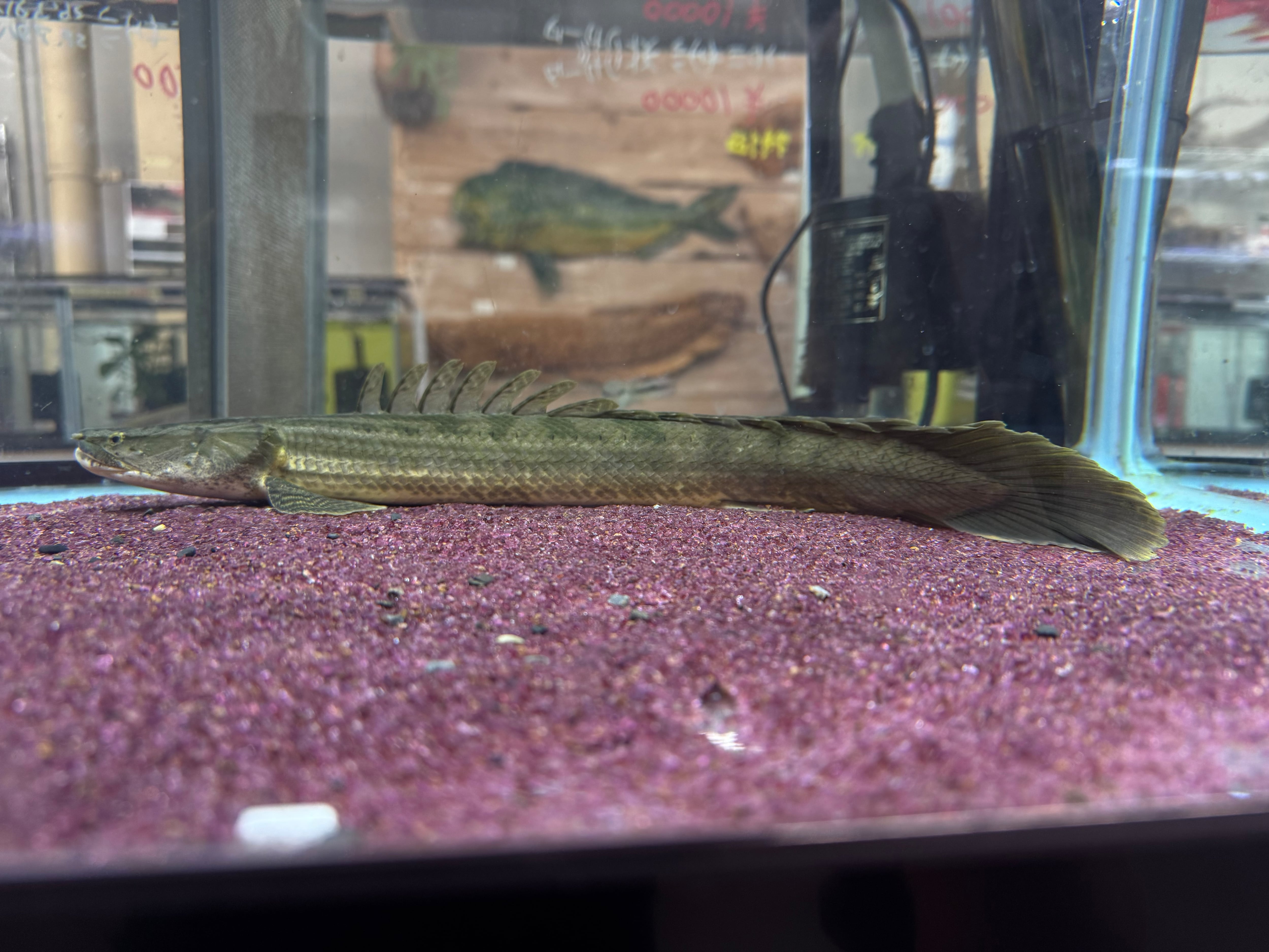 ⬛︎特徴: ⬛︎特徴: ポリプテルスは「多くの(Poly)ひれ(pterus)」という意味で、名のとおり背中に小離鰭(しょうりき)と呼ばれる菱形の背びれが10枚前後ある。これは、尾びれに当たる位置にまで並び、尾びれに該当する鰭はない。種類によって枚数異なる(ビキールは14~18枚並ぶのが特徴)またガノイン鱗や鼻管などもこの種の特徴。鰓呼吸と並行して空気呼吸をする。