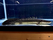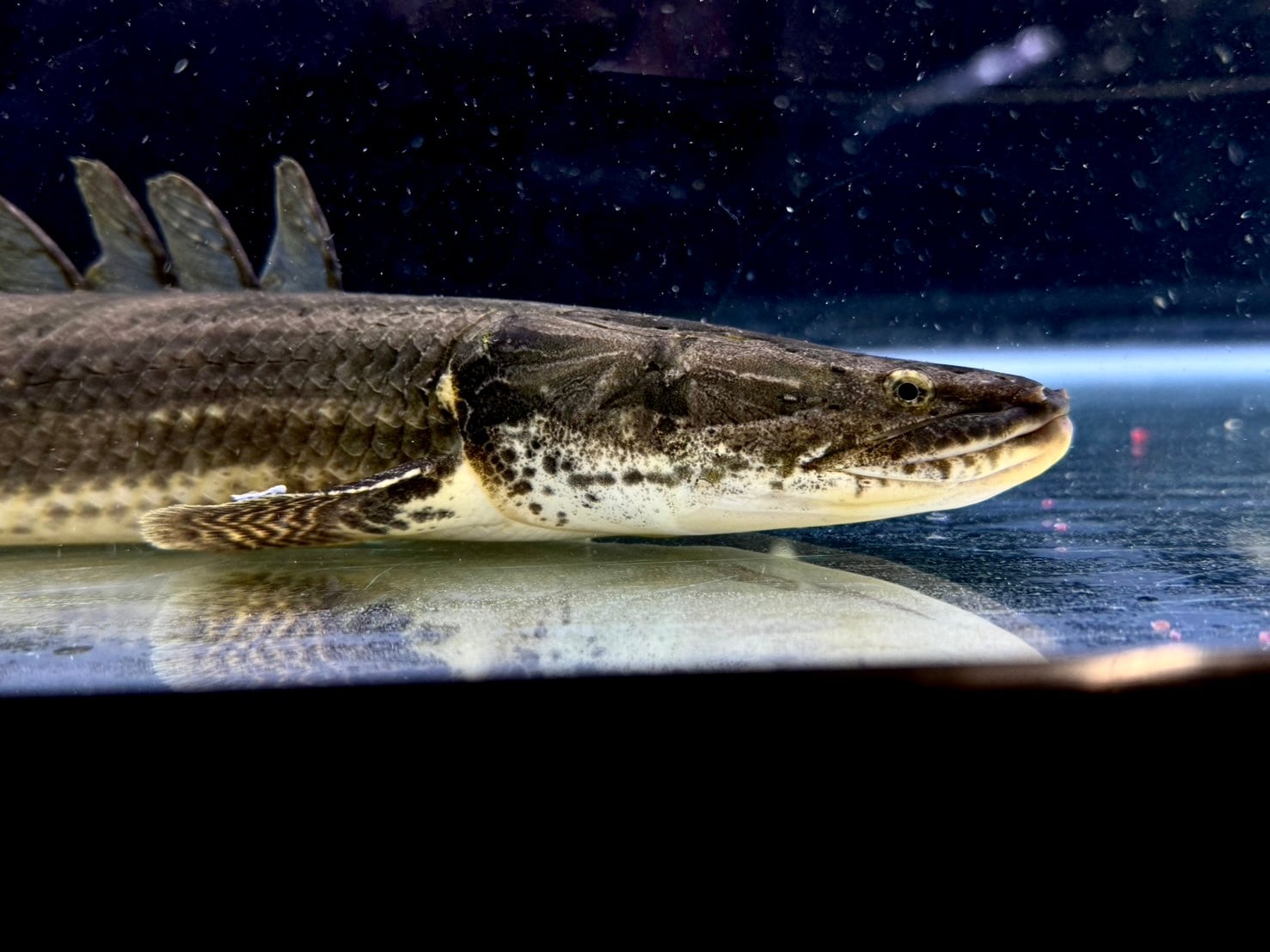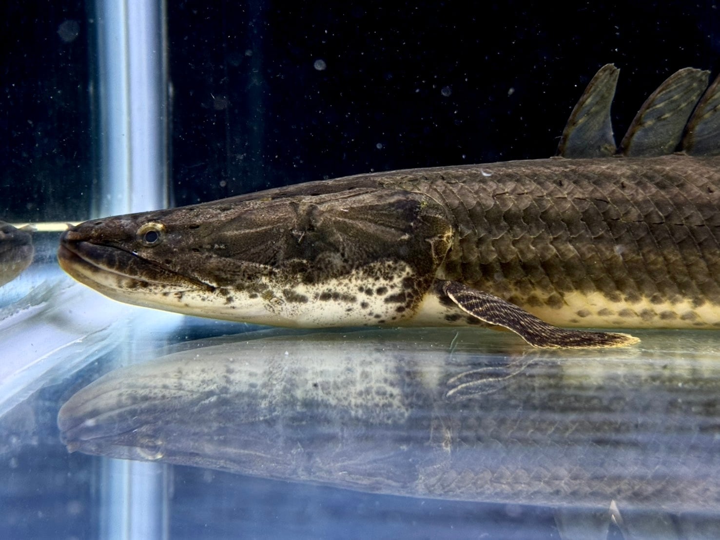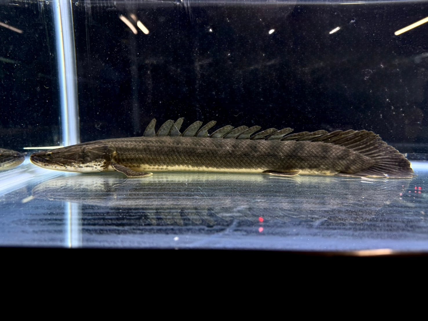 ⬛︎特徴: ⬛︎特徴: ポリプテルスは「多くの(Poly)ひれ(pterus)」という意味で、名のとおり背中に小離鰭(しょうりき)と呼ばれる菱形の背びれが10枚前後ある。これは、尾びれに当たる位置にまで並び、尾びれに該当する鰭はない。種類によって枚数異なる(ビキールは14~18枚並ぶのが特徴)またガノイン鱗や鼻管などもこの種の特徴。鰓呼吸と並行して空気呼吸をする。