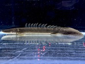 ⬛︎特徴: ⬛︎特徴: ポリプテルスは「多くの(Poly)ひれ(pterus)」という意味で、名のとおり背中に小離鰭(しょうりき)と呼ばれる菱形の背びれが10枚前後ある。これは、尾びれに当たる位置にまで並び、尾びれに該当する鰭はない。種類によって枚数異なる(ビキールは14~18枚並ぶのが特徴)またガノイン鱗や鼻管などもこの種の特徴。鰓呼吸と並行して空気呼吸をする。