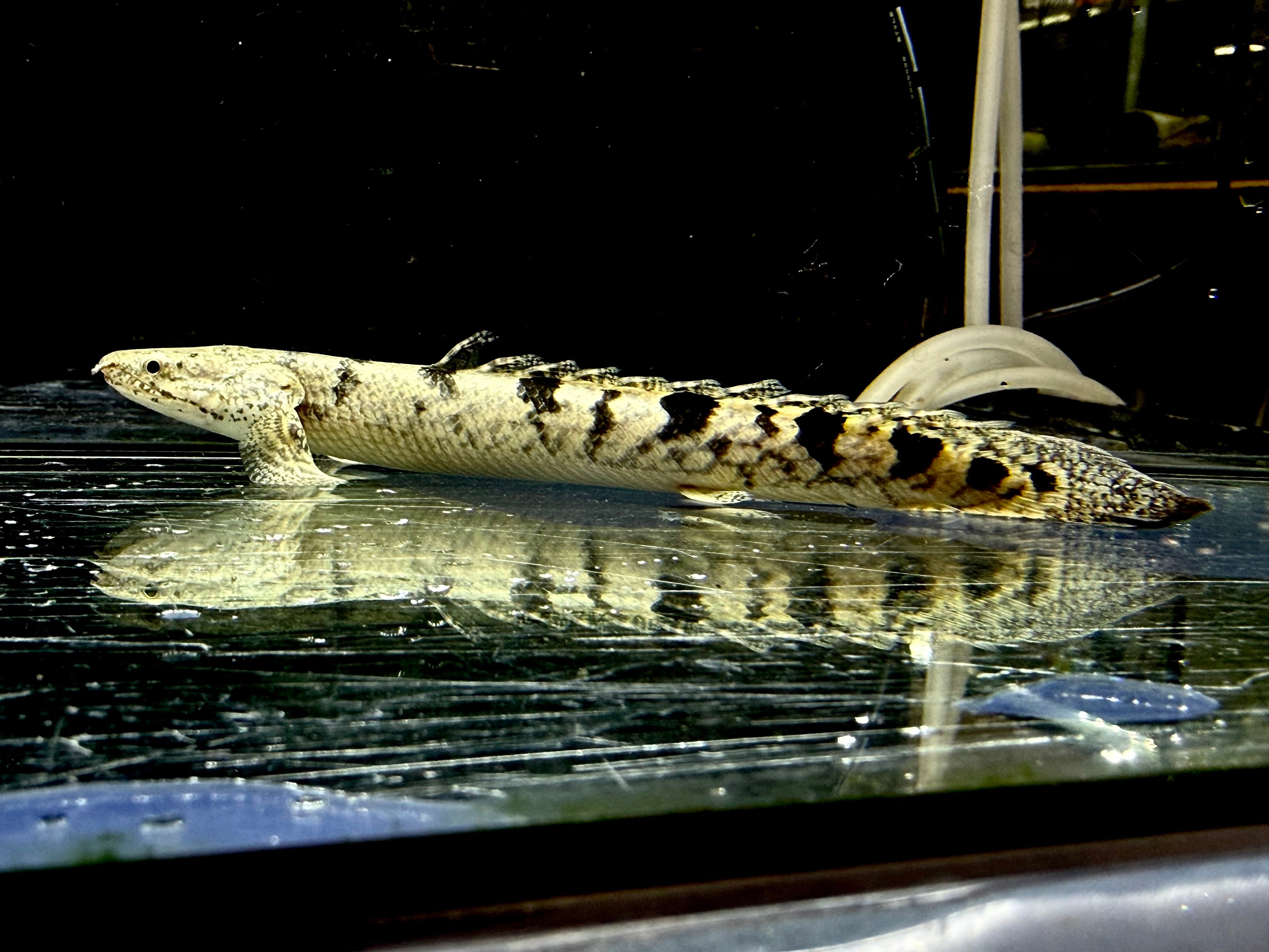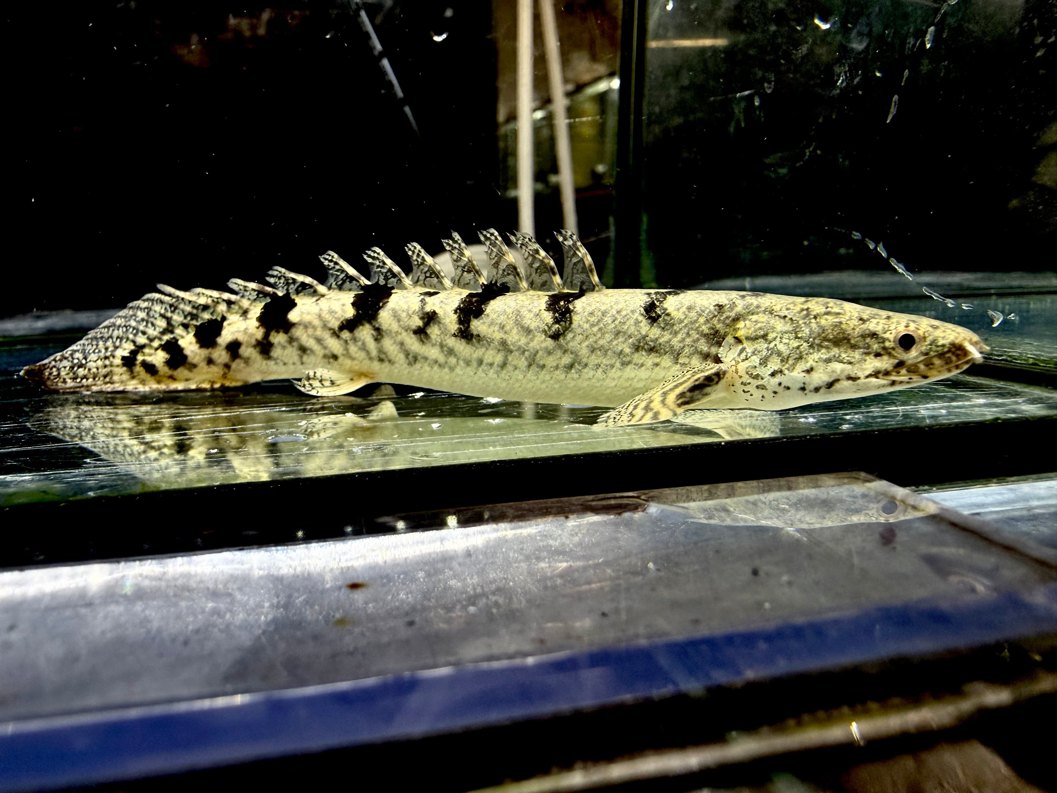 ⬛︎特徴: ポリプテルスは「多くの(Poly)ひれ(pterus)」という意味で、名のとおり背中に小離鰭(しょうりき)と呼ばれる菱形の背びれが10枚前後ある。これは、尾びれに当たる位置にまで並び、尾びれに該当する鰭はない。種類によって枚数異なる(デルヘッジは10~13枚並ぶ)またガノイン鱗や鼻管などもこの種の特徴。鰓呼吸と並行して空気呼吸をする。