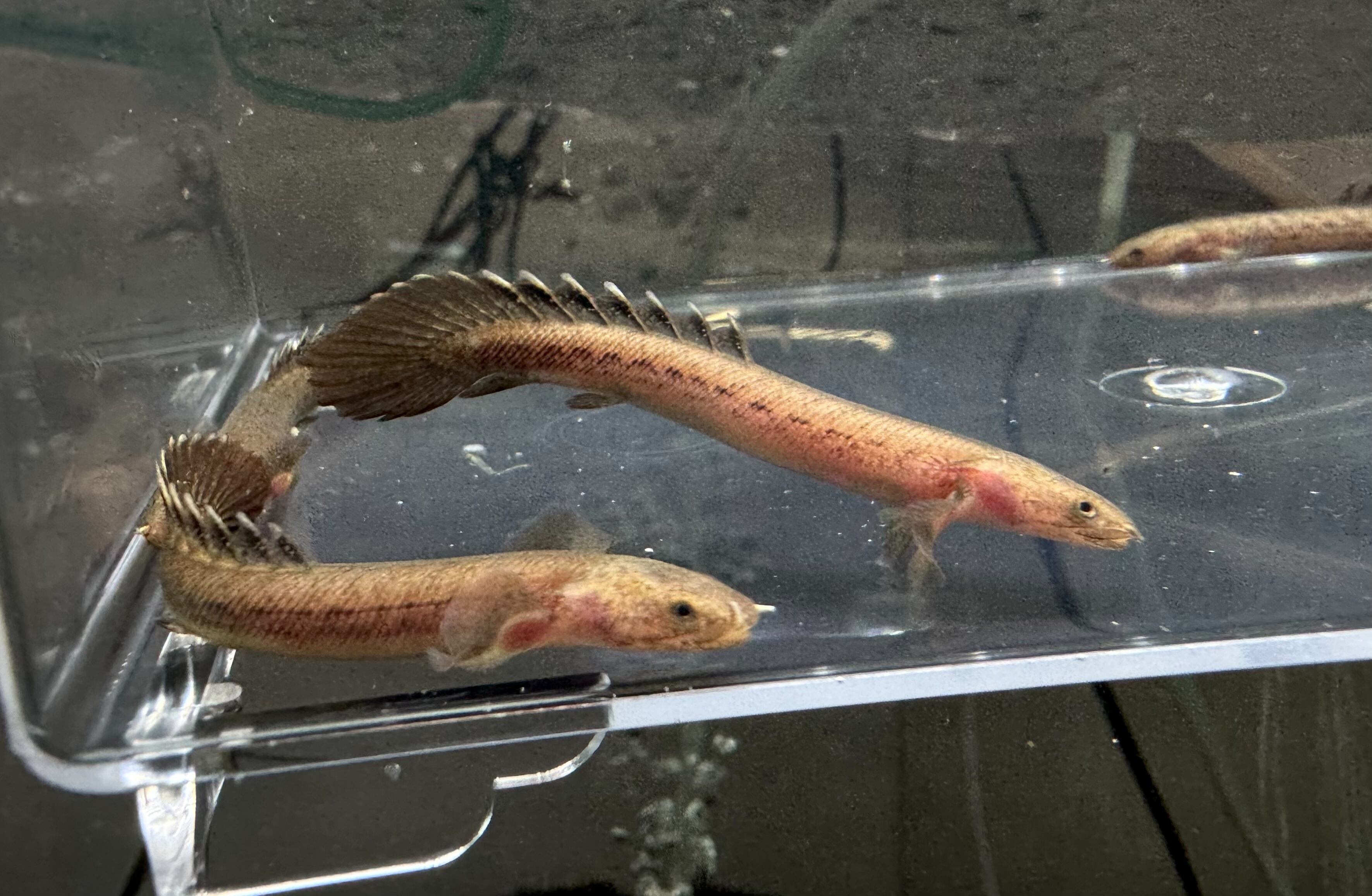 ⬛︎特徴: ポリプテルスは「多くの(Poly)ひれ(pterus)」という意味で、名のとおり背中に小離鰭(しょうりき)と呼ばれる菱形の背びれが10枚前後ある。これは、尾びれに当たる位置にまで並び、尾びれに該当する鰭はない。種類によって枚数異なる(トゥジェルシーは枚並ぶ)またガノイン鱗や鼻管などもこの種の特徴。鰓呼吸と並行して空気呼吸をする。